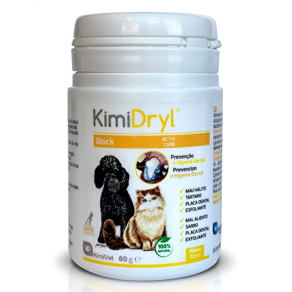 KimiDryl® Block Flocos é recomendado como suporte nutricional para o cuidado oral e dentário diário de cães e gatos. Contém alga seca, Ascophyllum nodosum, extremamente rico em nutrientes indispensáveis para o bom funcionamento do organismo do animal, com vitaminas, minerais e aminoácidos. Ajuda em casos de placa bacteriana, tártaro e mau hálito, promovendo uma boa higiene oral. O KimiDryl® Block Flocos está igualmente indicado como suporte nutricional e manutenção do tecido gengival para cães e gatos.
