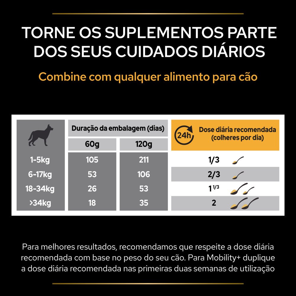 PRO PLAN Mobility+ é um suplemento alimentar que ajuda a suportar as articulações do seu cão. Um pó altamente palatável, com uma mistura concentrada de membrana de ovo (fonte de colagénio), ácido hialurónico purificado, mexilhão da Nova Zelândia e glucosamina.