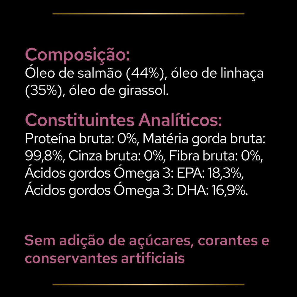 Óleo de salmão (44%), óleo de linhaça (35%), óleo de girassol.