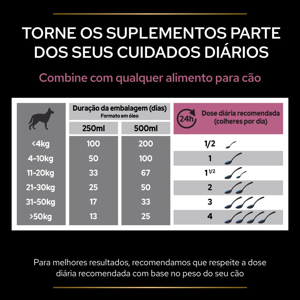Ofereça uma vez por dia, com uma das refeições do seu cão. Coloque o óleo sobre o alimento do seu cão. Para melhores resultados, use-o diariamente como parte da sua rotina diária de alimentação.